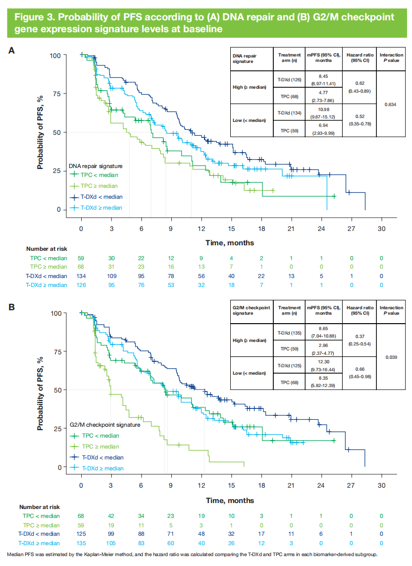 与TPC相比,T-DXd在所有分析的生物标志物亚组中均表现出有临床意义的PFS和ORR改善,包括HER2基因表达水平、BRCA1/2或HRR基因状态改变、DDR/细胞增殖基因特征状态以及免疫状态(sTILs)。本分析有一定局限性,包括某些生物标志物亚组的患者数量较少,以及循环肿瘤DNA组合测序在检测结构变异(BRCA1/2和HRR改变状态)方面的局限性。